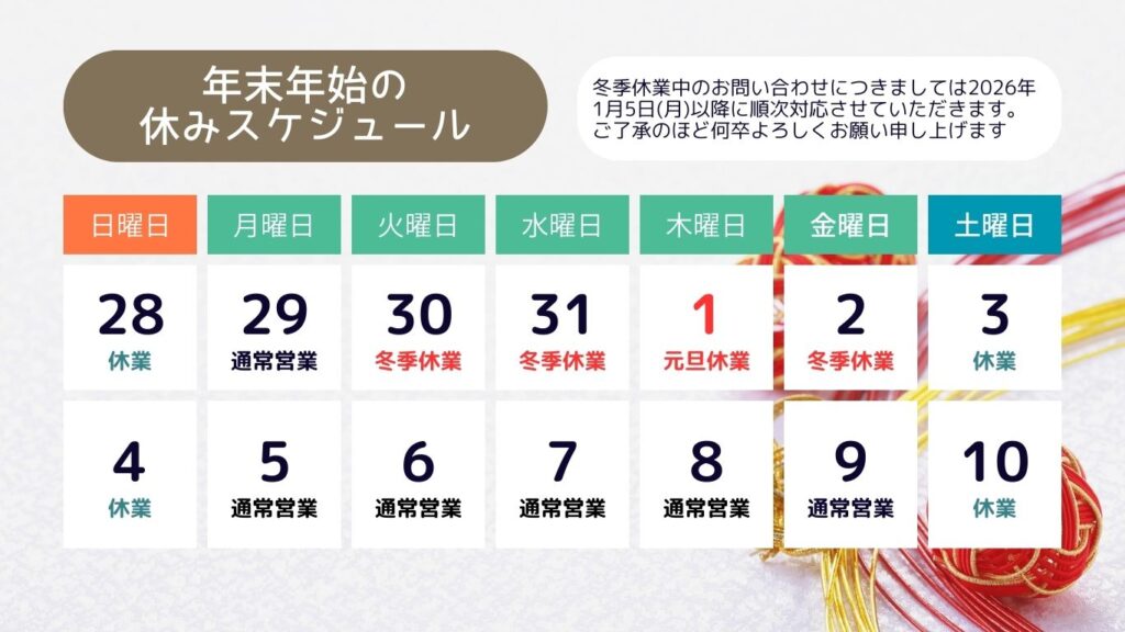 上記カレンダー通り、今年は12/29(月)で仕事納め取りなります。